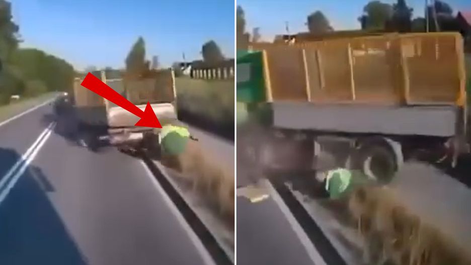 Na wideo widzimy, co się stało na skutek zdarzenia. Mężczyzna, który jechał na pojeździe najprawdopodobniej zbierającym odpady, aż został wyrzucony w powietrze.