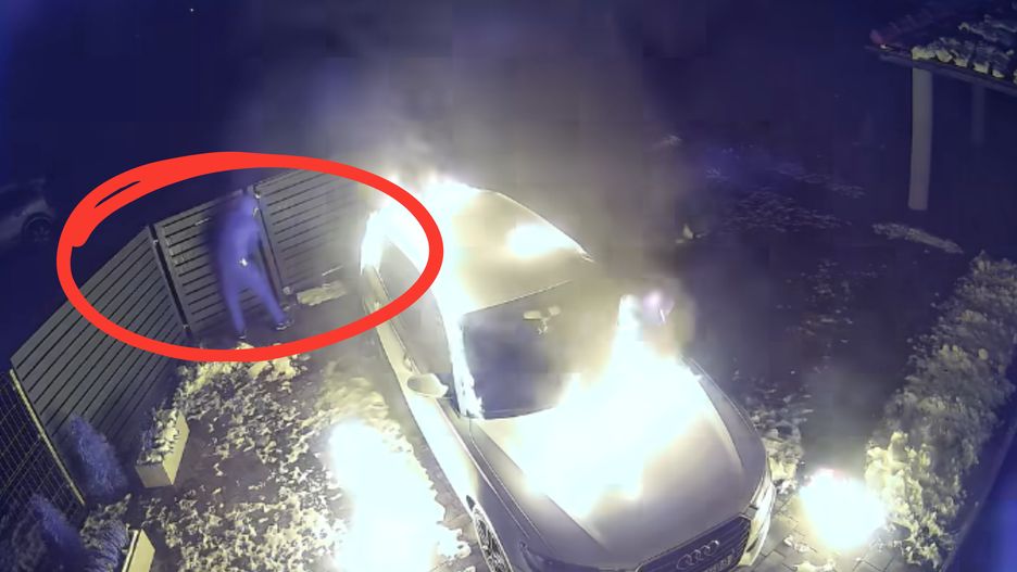 Na nagraniu monitoringu widać, jak zakapturzony mężczyzna rzuca zza bramy pojemnik z benzyną. Zaraz po tym odpala koktajl Mołotowa i rzuca nim w tył pojazdu. Co prawda ogień wybucha, ale niewielki. Sprawca decyduje się przeskoczyć przez płot, oblać samochód łatwopalną substancją i podpalić. Scenariusz się sprawdza - samochód staje w płomieniach. Sprawca ucieka.